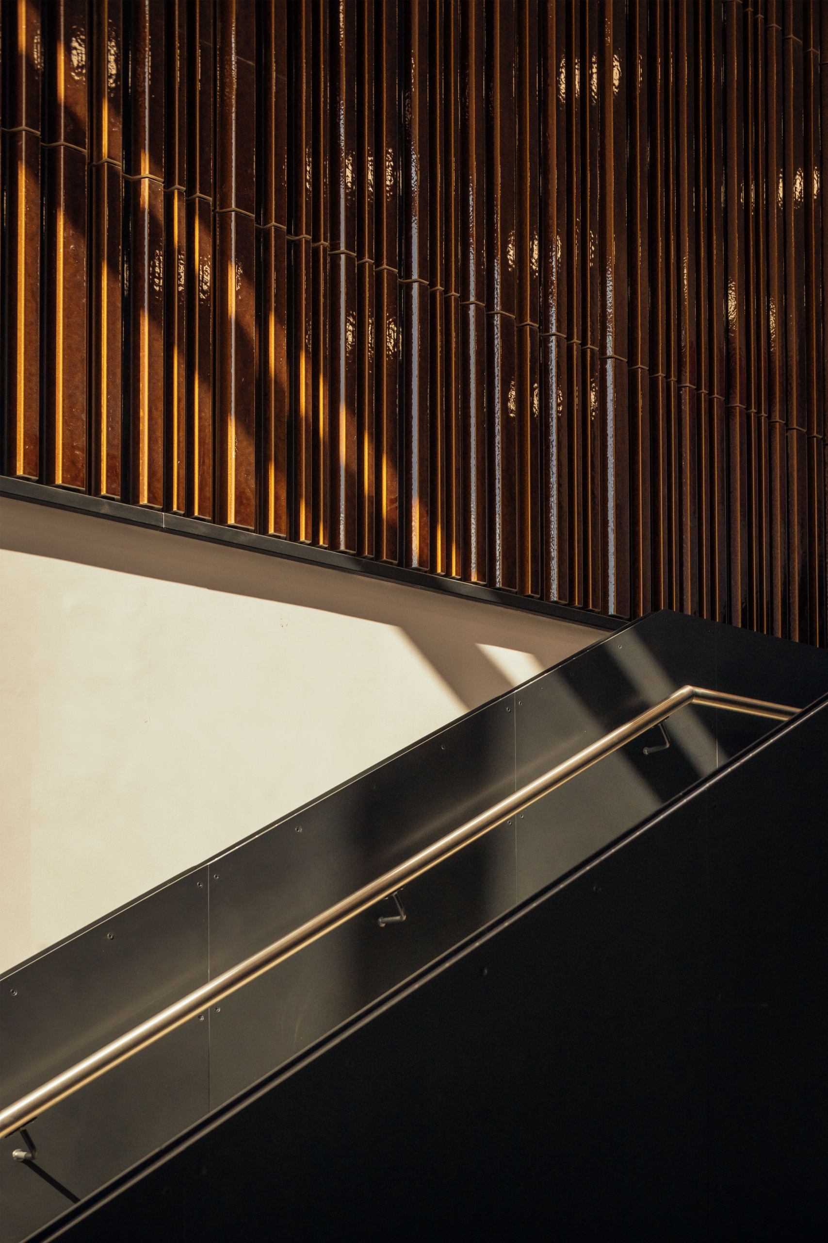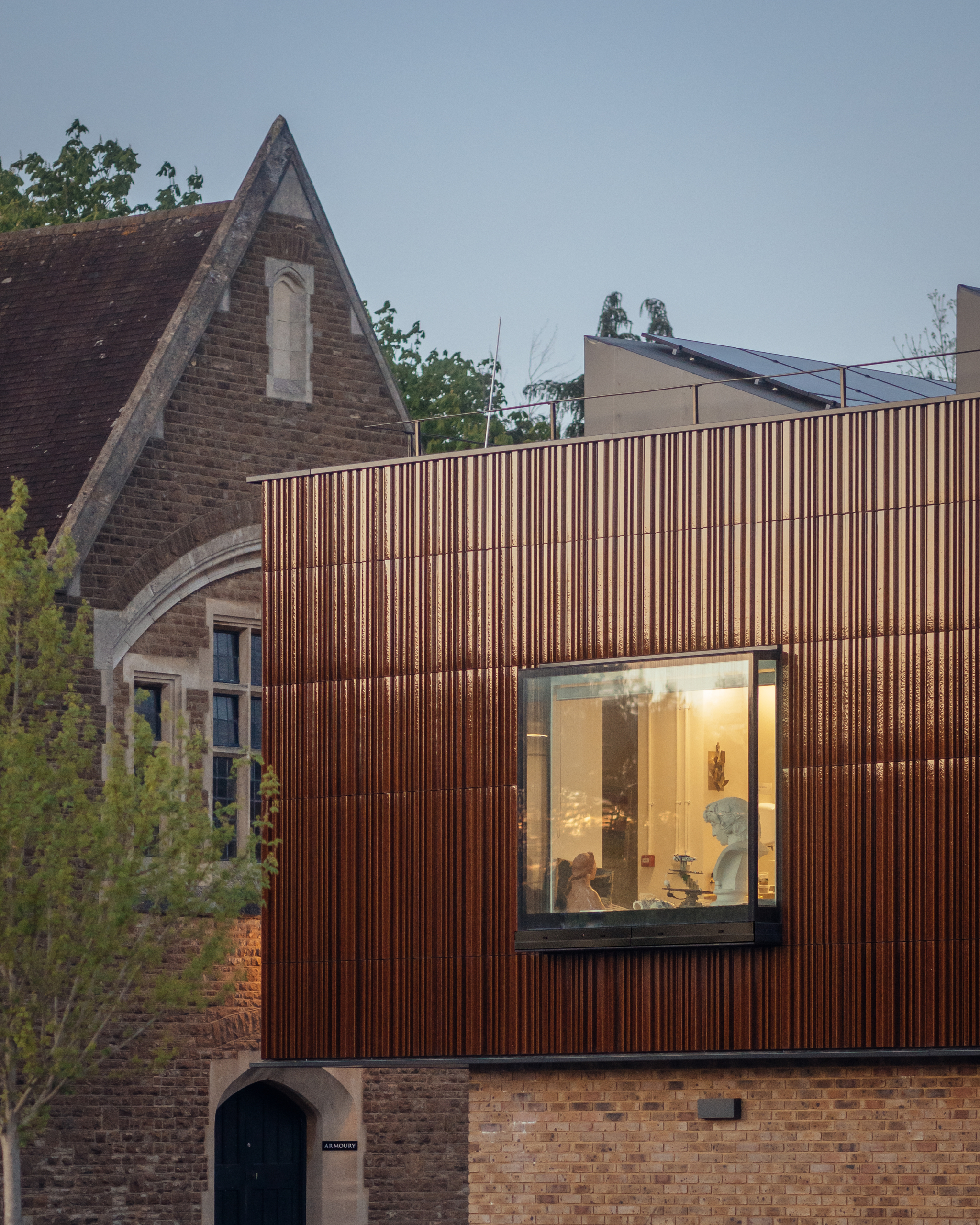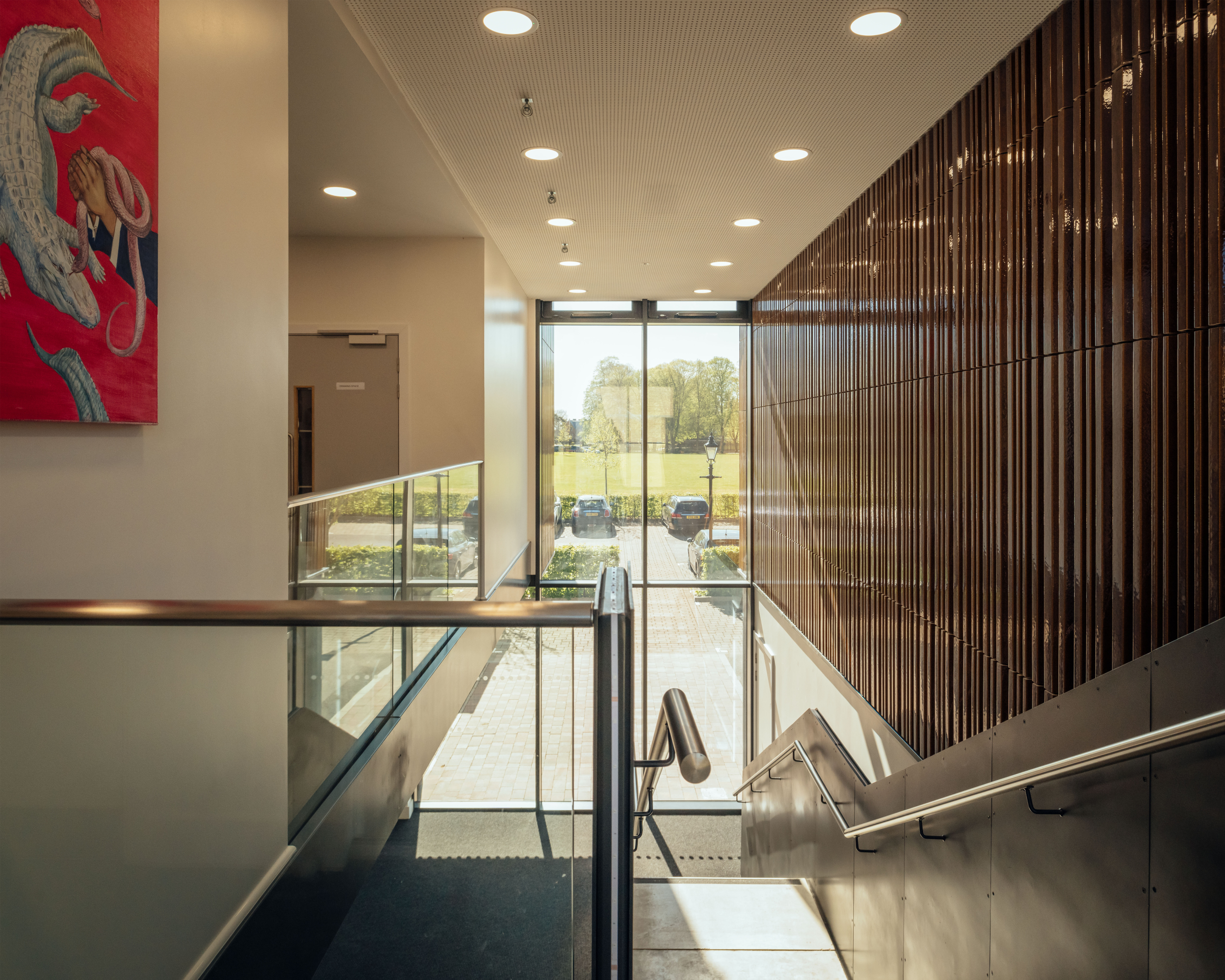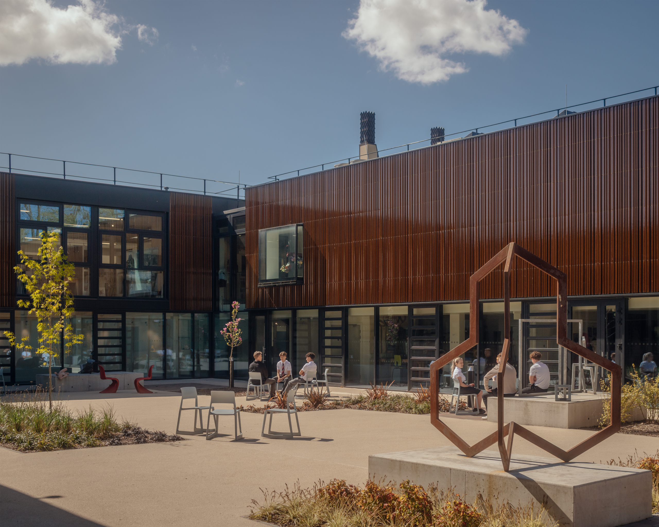The new extension features a distinctive façade of vertical clay profiled tiles, referencing the historic clay tile banding found across campus. A new glazed link connects the three department buildings, serving as both a central hub with shared entrance, gallery spaces, and a landscaped courtyard for outdoor learning and social interaction.