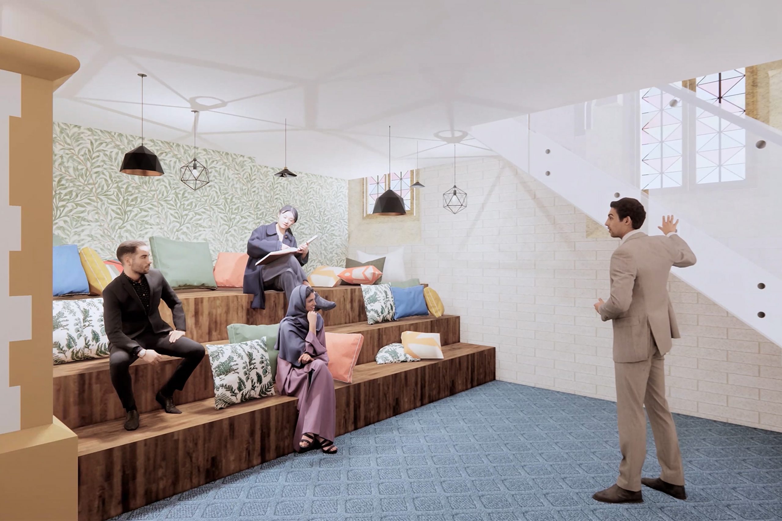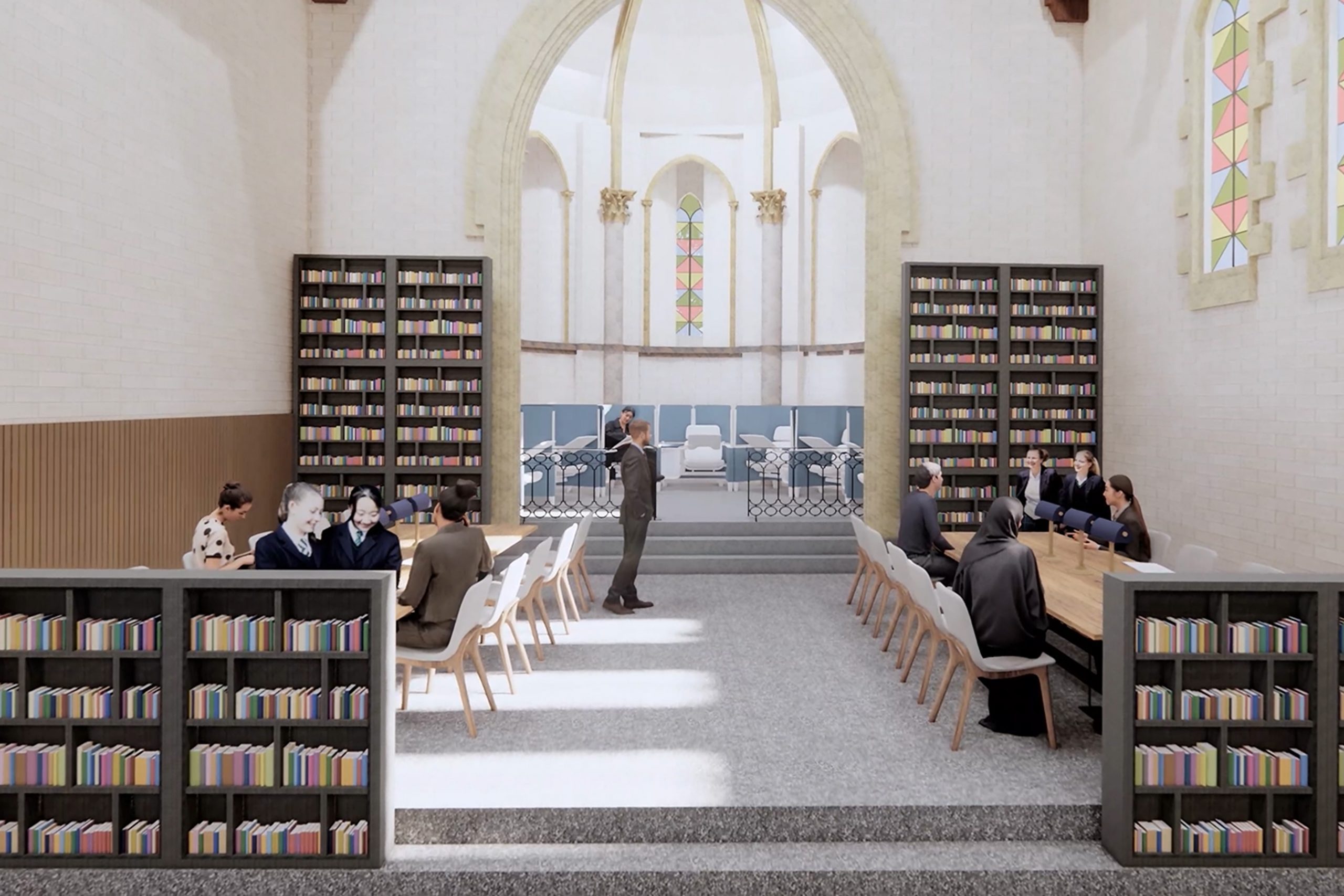 The refurbishment includes the construction of new mezzanine floors within the seating aisle areas and large internal glazed screens to subdivide the church, these works will form a contemporary, multi-functional study centre including the library, break out zones and a refreshment area.